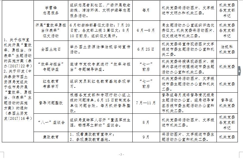 为贯彻落实市直机关工委《关于“重效率勇担当作表率”主题活动目标落实的通知》精神,扎实开展“重效率勇担当作表率”主题活动,现制定《市局“重效率、勇担当、作表率”主题活动目标表》(见附件),请遵照执行。