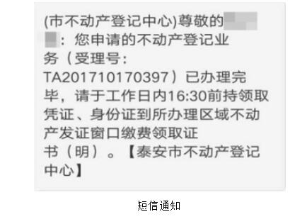 3、为方便客户及时了解不动产权证(明)领取时间,合理安排时间到不动产登记中心领取不动产权证(明),泰安市不动产登记中心已开启短信通知服务。