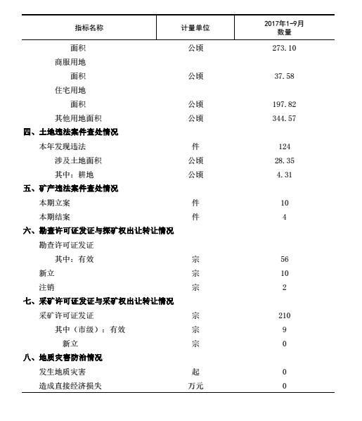 泰安市2017年1-9月国土资源主要统计指标