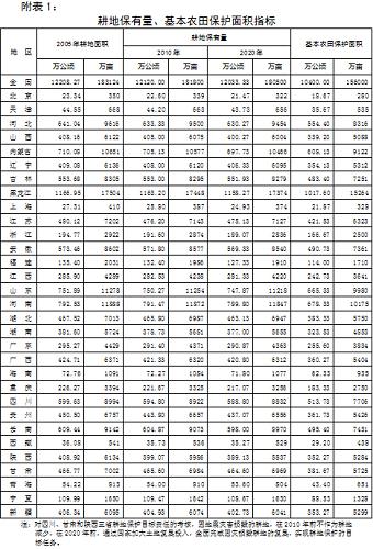 ──守住18亿亩耕地红线。全国耕地保有量到2010年和2020年分别保持在12120万公顷(18.18亿亩)和12033.33万公顷(18.05亿亩)。规划期内,确保10400万公顷(15.6亿亩)基本农田数量不减少、质量有提高。