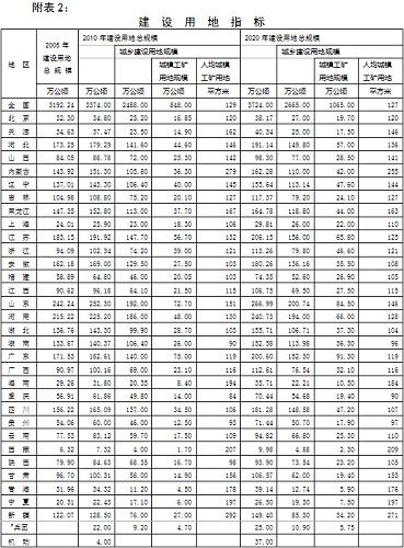 根据各土地利用分区的调控方向和差别化的区域土地利用政策,综合经济社会发展水平、发展趋势、资源环境条件、土地利用现状和潜力等因素,分别确定各省、自治区、直辖市的耕地保有量、基本农田保护面积、城乡建设用地规模、人均城镇工矿用地、新增建设占用耕地规模等土地利用约束性指标,以及园地面积、林地面积、牧草地面积等预期性指标(详见附表1-6),强化省级政府的土地利用调控责任。