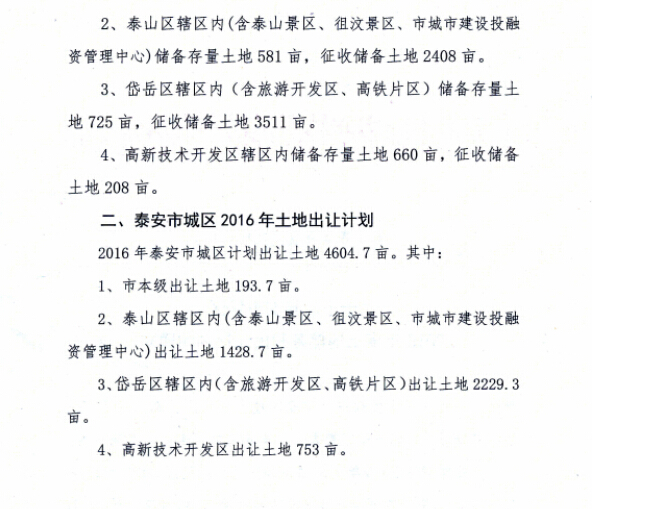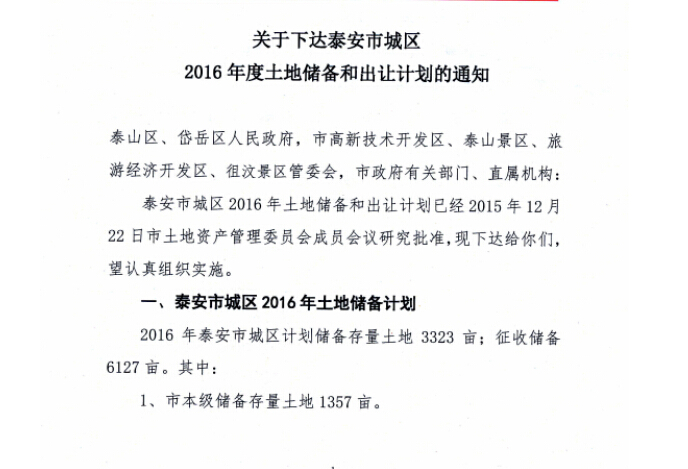 关于下达泰安市城区2016年度土地储备和出让计划的通知
