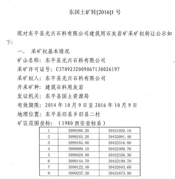 东平县光兴石料有限公司建筑用石灰岩矿采矿权转让信息公示