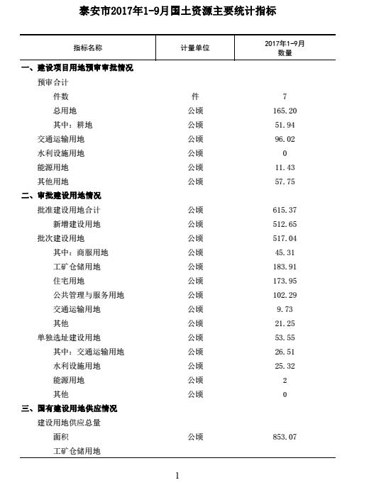泰安市2017年1-9月国土资源主要统计指标