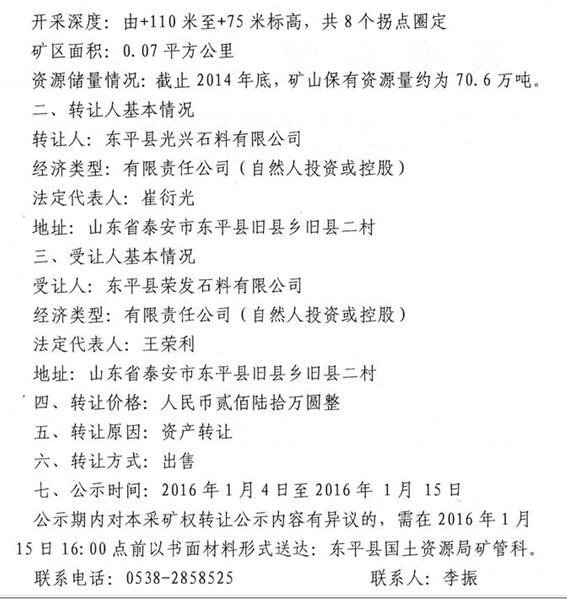 东平县光兴石料有限公司建筑用石灰岩矿采矿权转让信息公示
