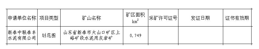 山东省新泰市大山口矿区上峪矿段水泥用灰岩矿矿业权审批结果